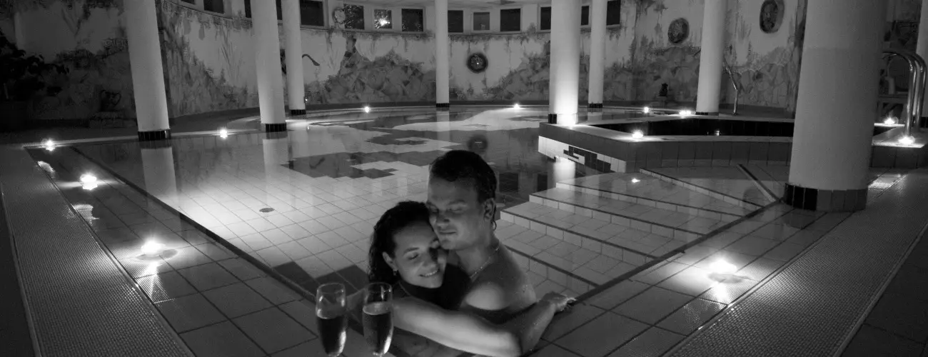 • Római fürdő korlátlan használata: finn-és infraszauna, napfény kabin, élménymedence, termálvizes vízsugaras medence, gőzkabin, jakuzzi, jeges csobbanó medence, kültéri medence, napozó terasz